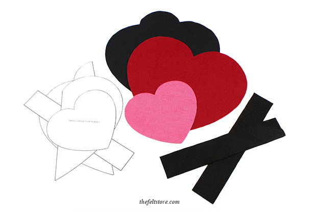 embroidery needle sew the black backing to the larger red heart. Ensure the straps on the black backing piece and the pink heart on the larger red heart are facing out. Make sure to leave the top open for pocket access. We used a blanket stitch for this step (you can find a great tutorial from Apartment Therapy